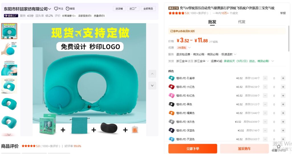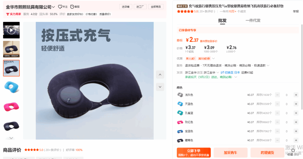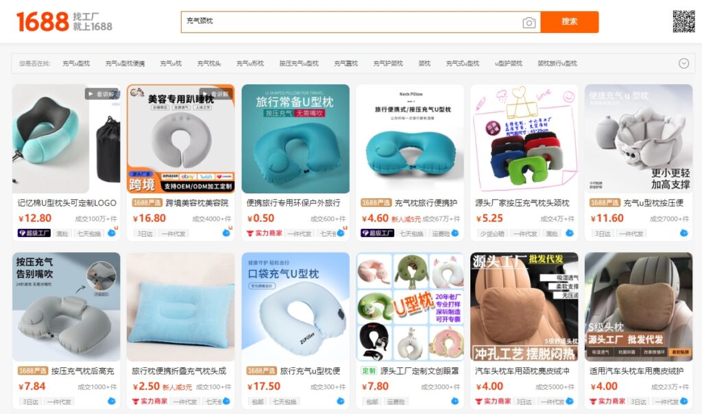 アリババで検索キーワード「充气颈枕」と検索すると、たくさんの商品が出ます。