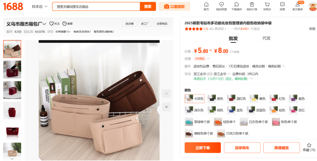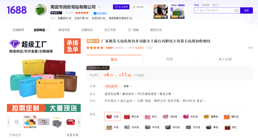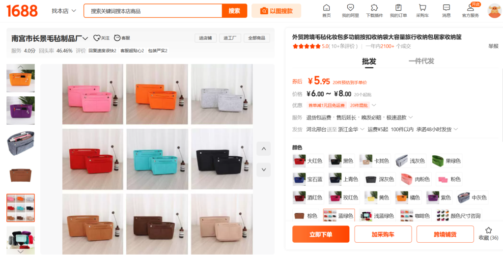 このショップの最小ロットは3個からで、色やサイズを組み合わせて3個以上から注文可能です。