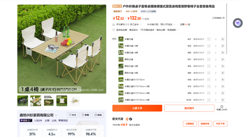「野营桌」と入力すると、さまざまな商品が表示されます。