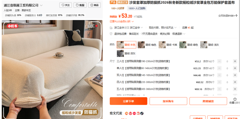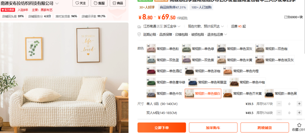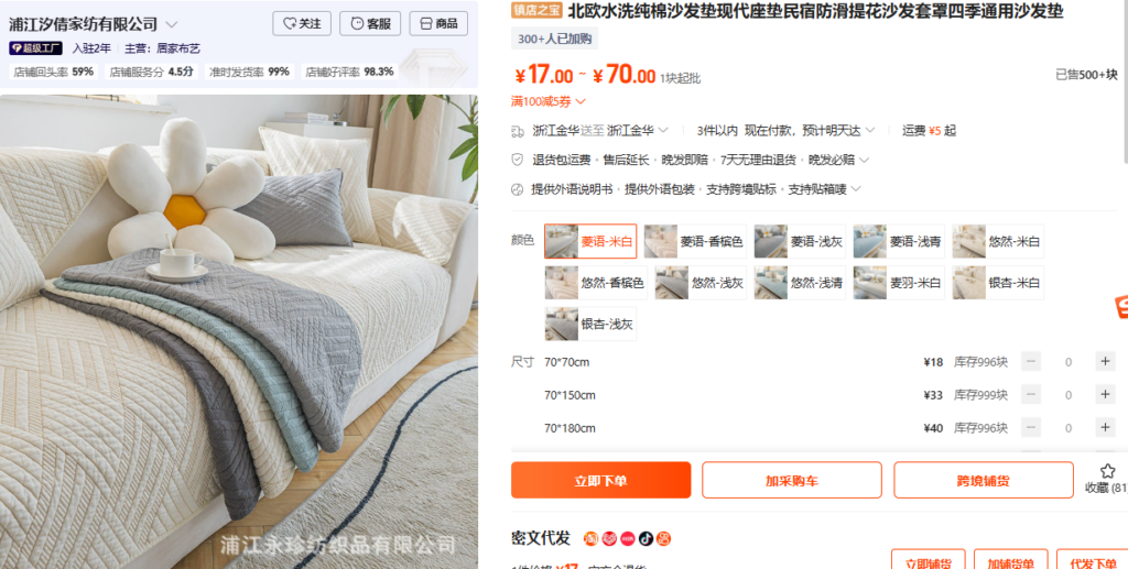 1688で「沙发罩」を検索すると沢山商品が出てきます。