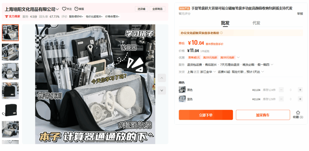 今回は、Amazonで人気のペンケース大容量を、アリババでリサーチしてご紹介いたします。ご紹介いたします。 1店舗目: https://detail.1688.com/offer/960653217673.html 最低ロット:1個価格:11.96~11.04元素材:ポリエステルカラー:4色OEM最低ロット... -